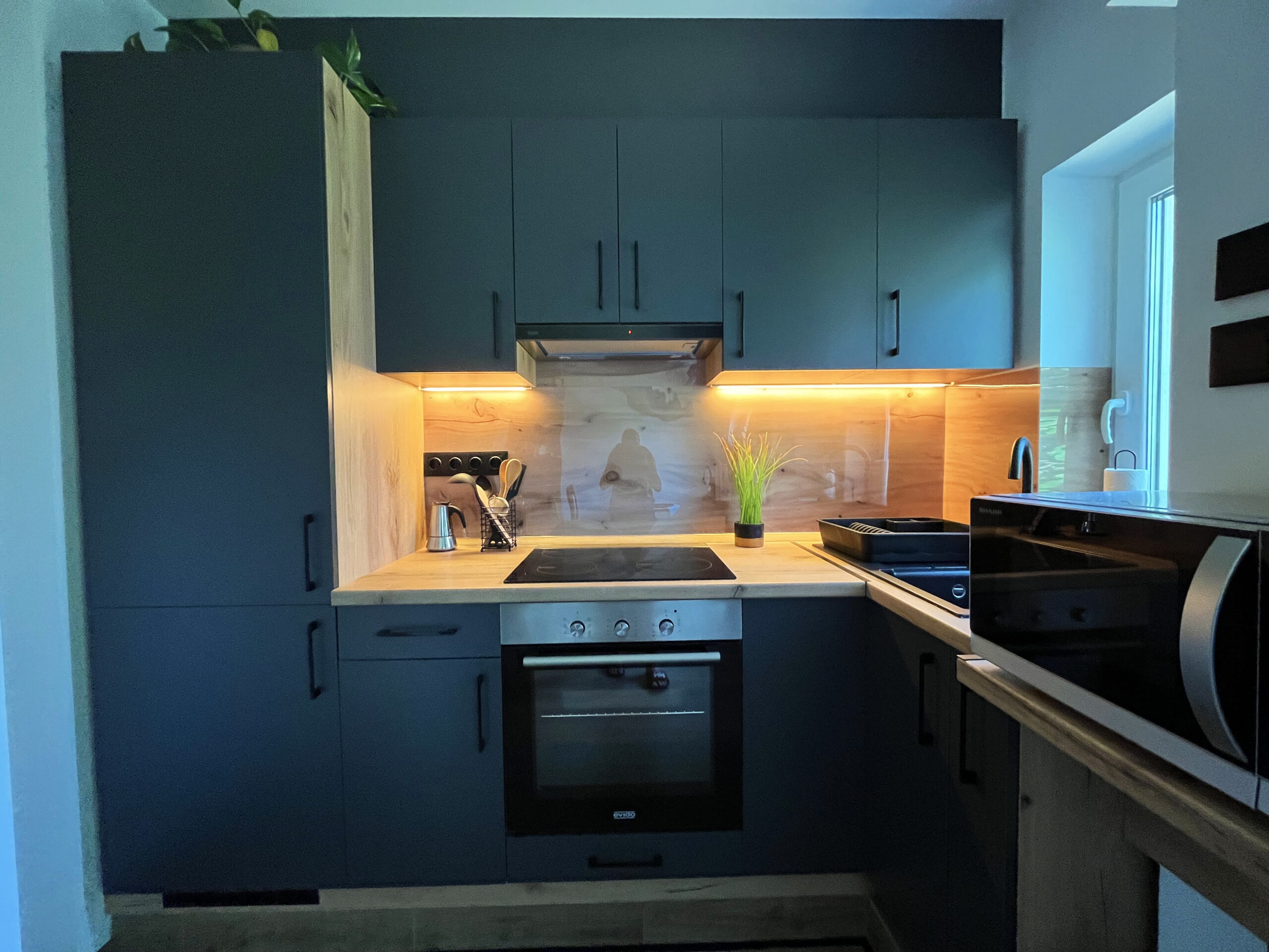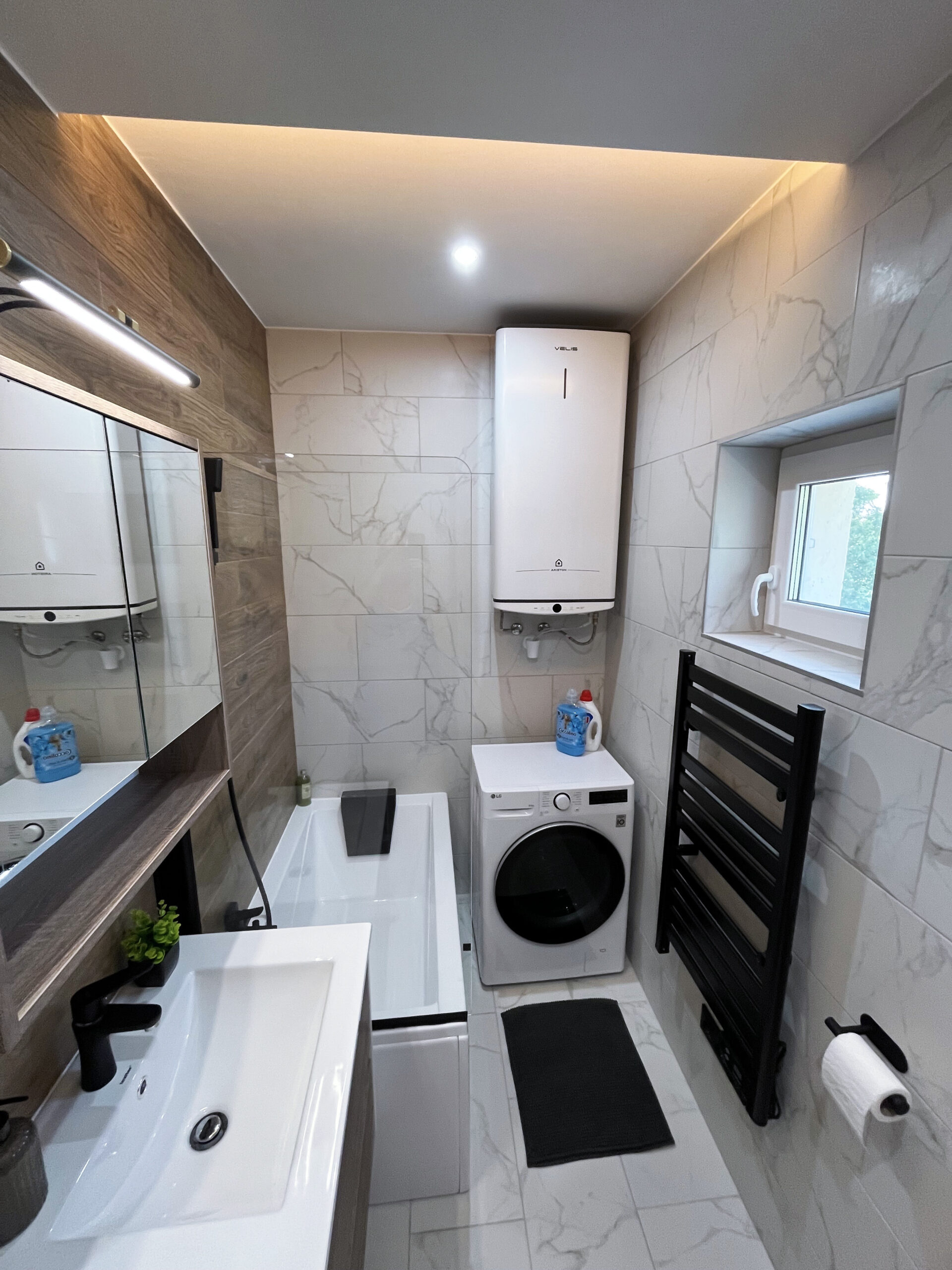 A teljesen felszerelt konyha lehetőséget ad egy nyugodt reggeli vagy egy közös vacsora elkészítésére, a fürdőkáddal ellátott fürdőszoba pedig a lelassulás pillanatait teszi teljessé. Az apartman légkondicionált, mosógéppel felszerelt, így hosszabb tartózkodás esetén is kényelmes megoldást kínál.